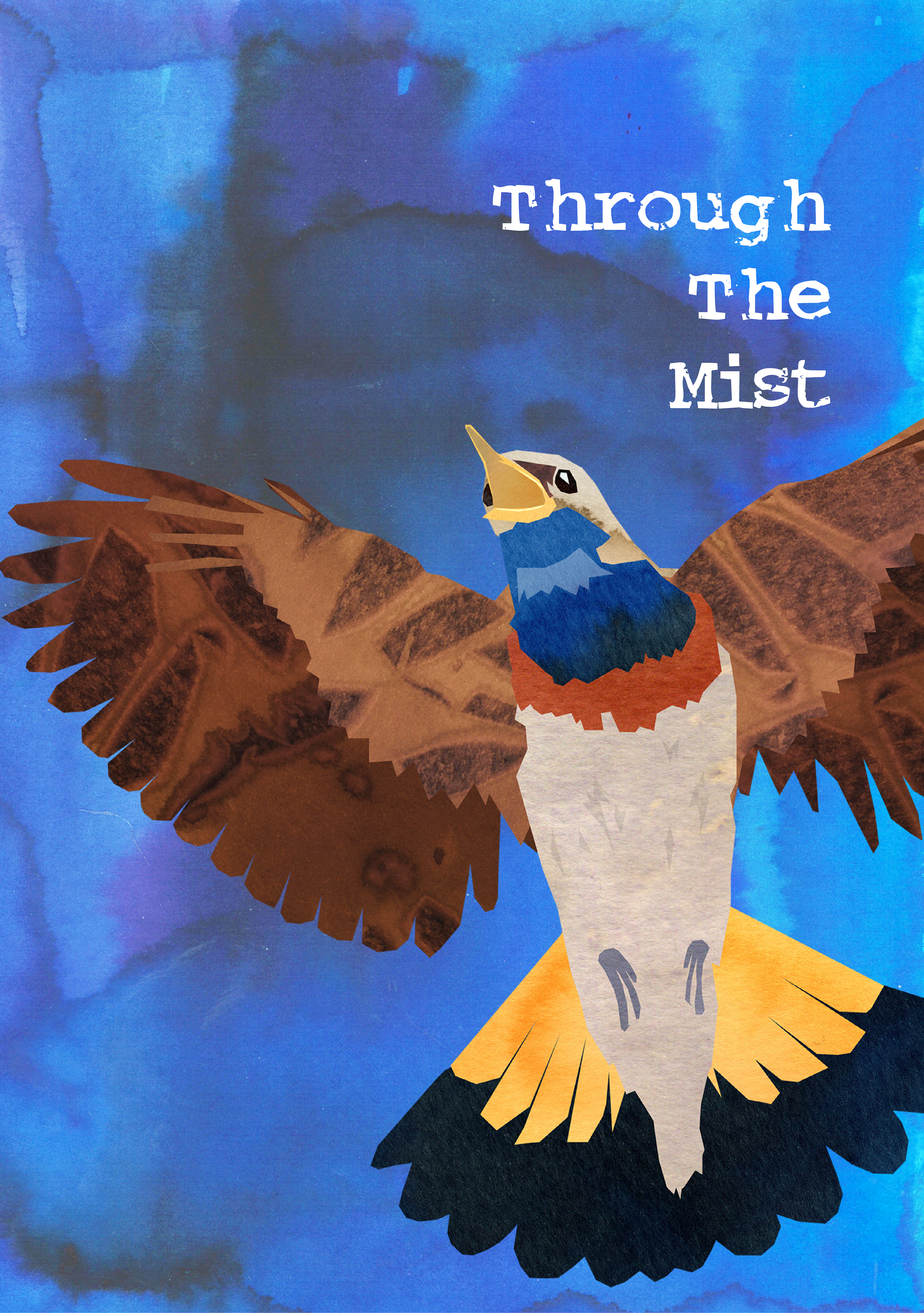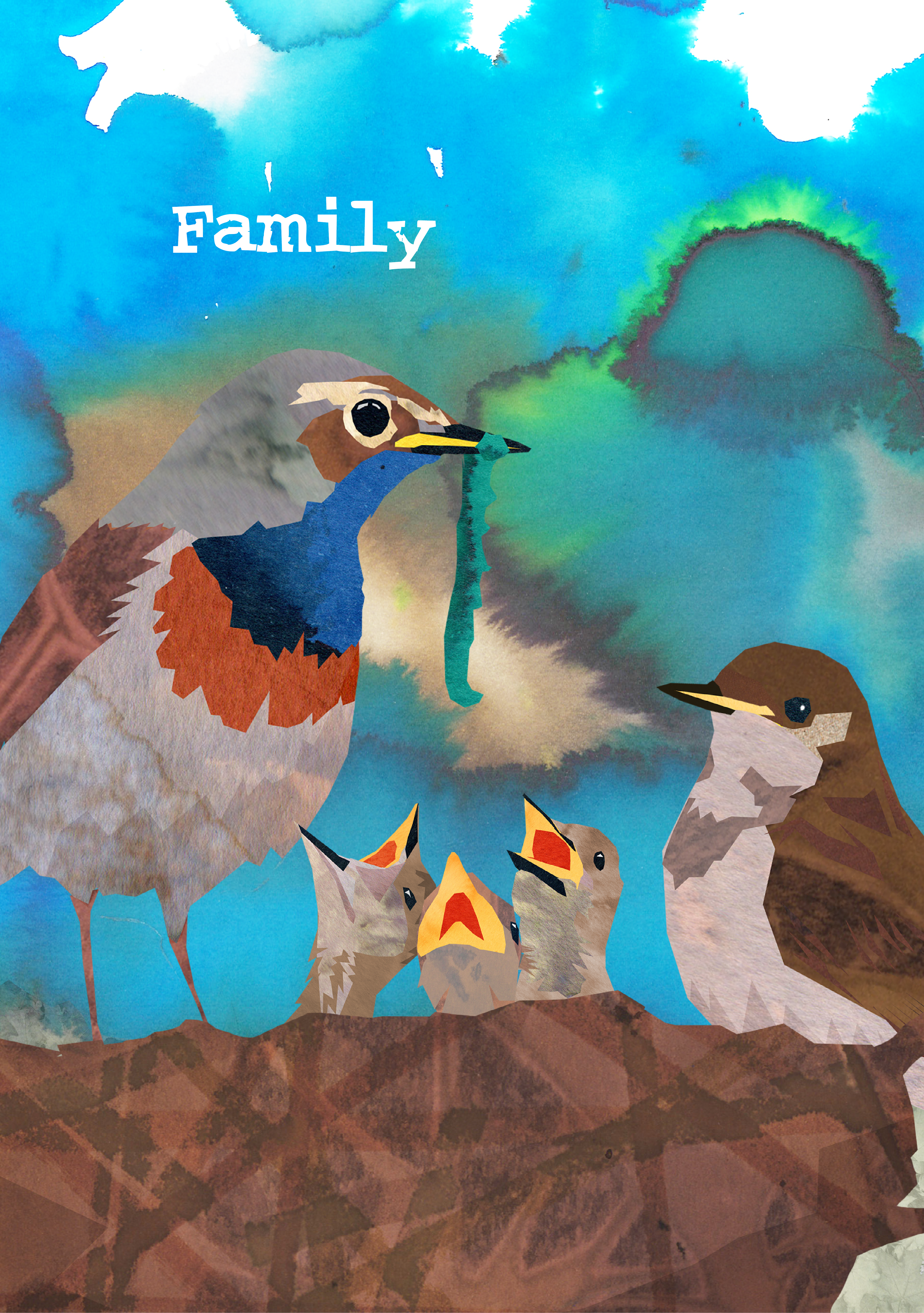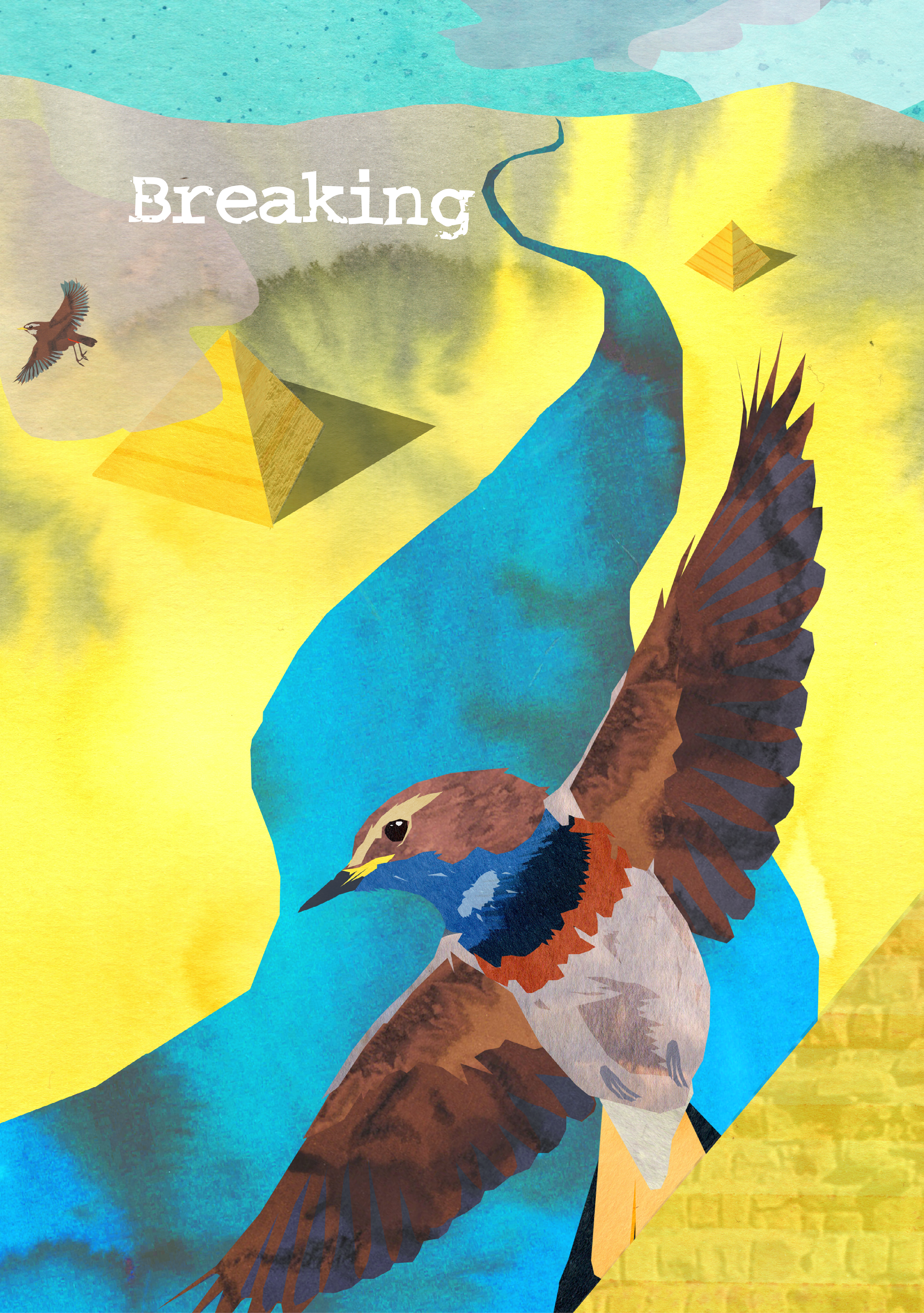 The technique used is a digital collage of paper stained by ecoline; a process that requires embracing randomness to create texture by guiding the drying process. The result is a visually striking, multi-layered piece of illustration.